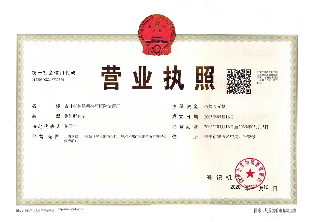 吉林省神經精神病醫院制藥廠始建于1986年,原名吉林省精神衛生研究所制藥廠,2002年更名為吉林省神經精神病醫院制藥廠,隸屬于吉林省神經精神病醫院。藥廠坐落于風景秀麗、交通發達、環境優美的英雄城——四平市。